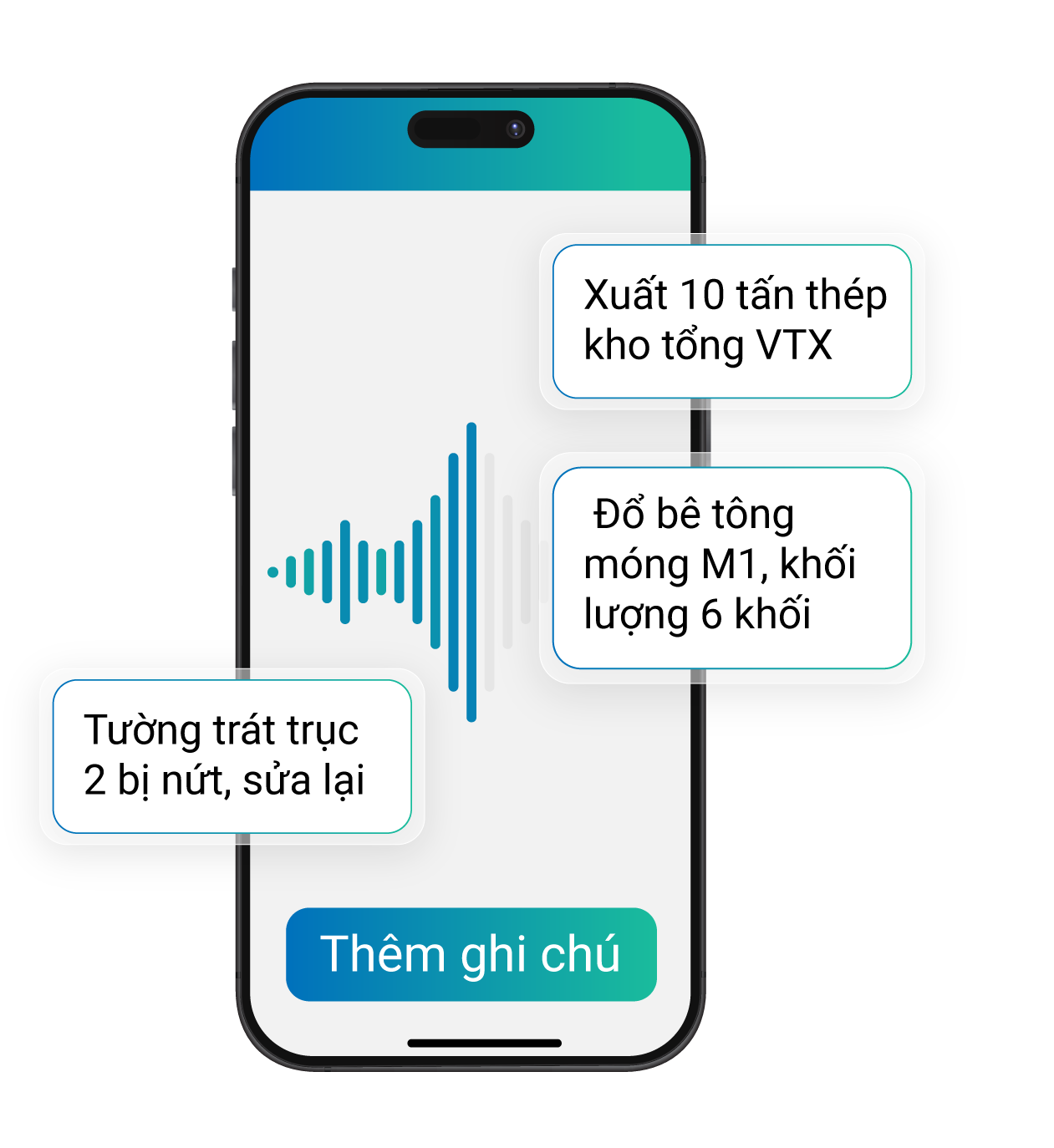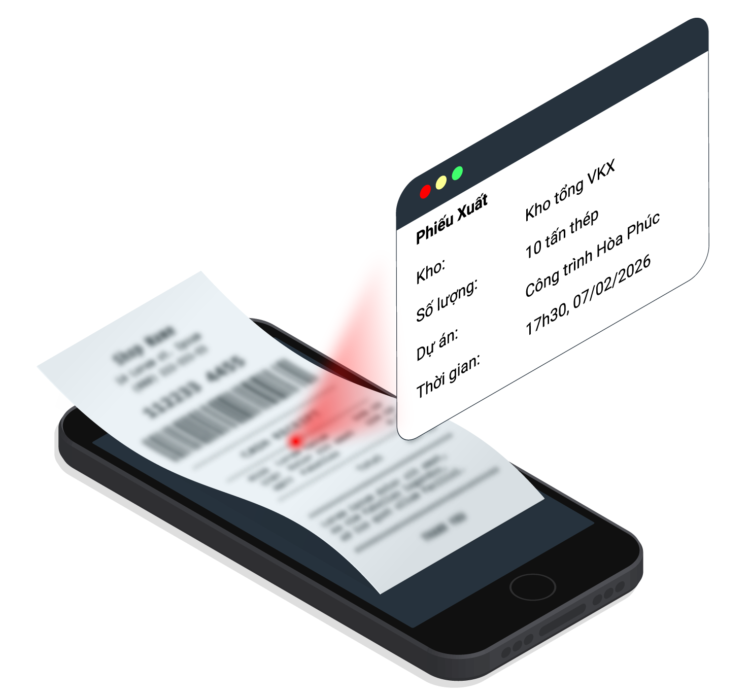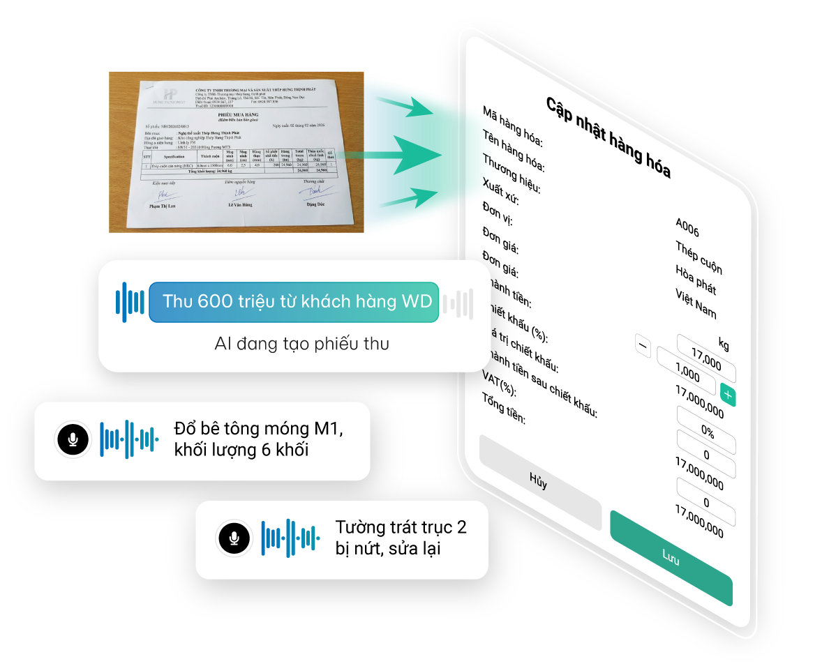 Giải phóng Kỹ sư, Chỉ huy trưởng, Giám sát, Thủ kho vật tư tại công trường,… khỏi hàng giờ nhập liệu thủ công. Biến mọi hình ảnh/ voice/ văn bản giấy thành dữ liệu số chuẩn hóa trong tích tắc.